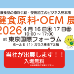 東京国際フォーラム ホールE(1)ガラス棟 地下2Fにて開催されます「健康原料・OEM展 2026」に出展します。